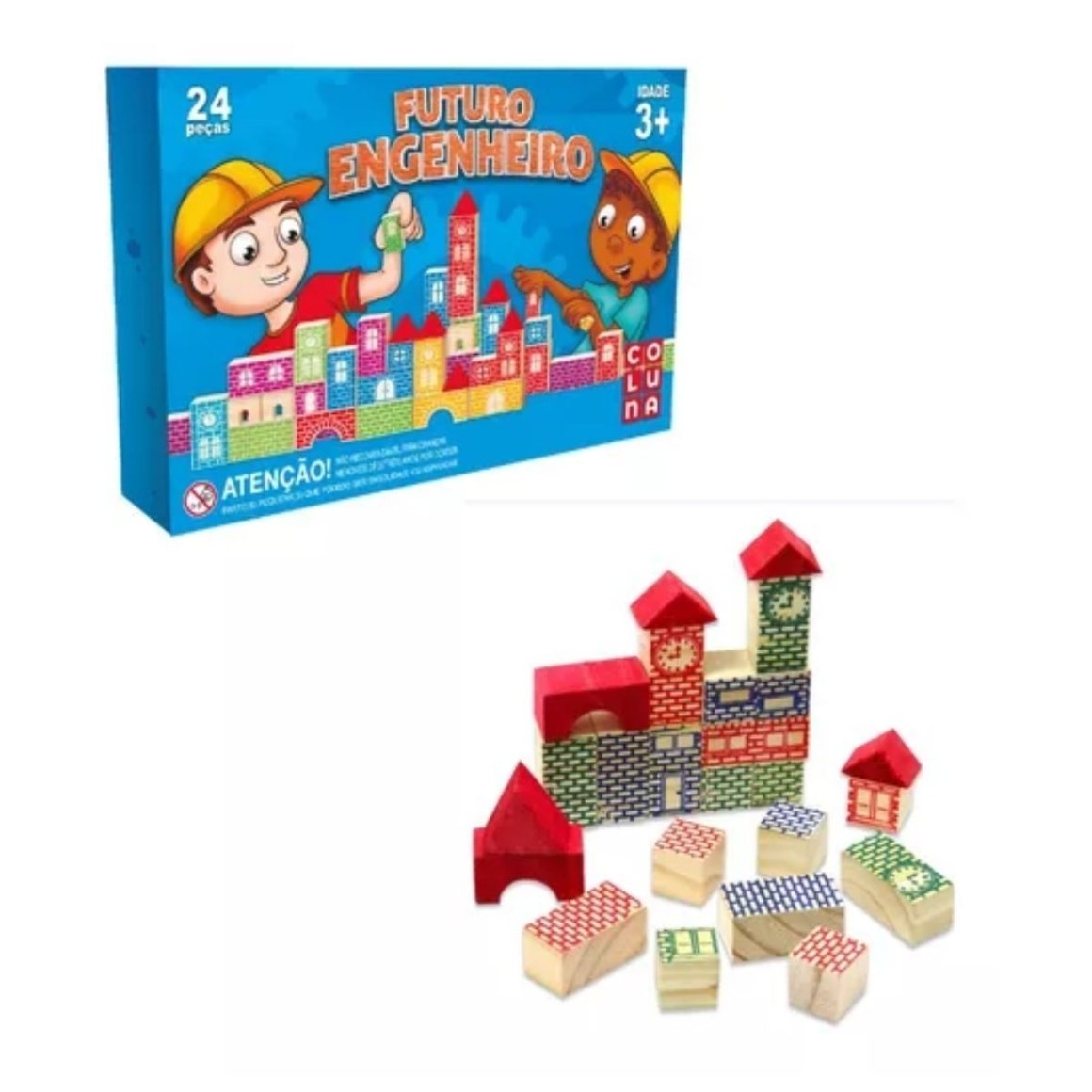 - Peças: 24 blocos de montar coloridos e variados.